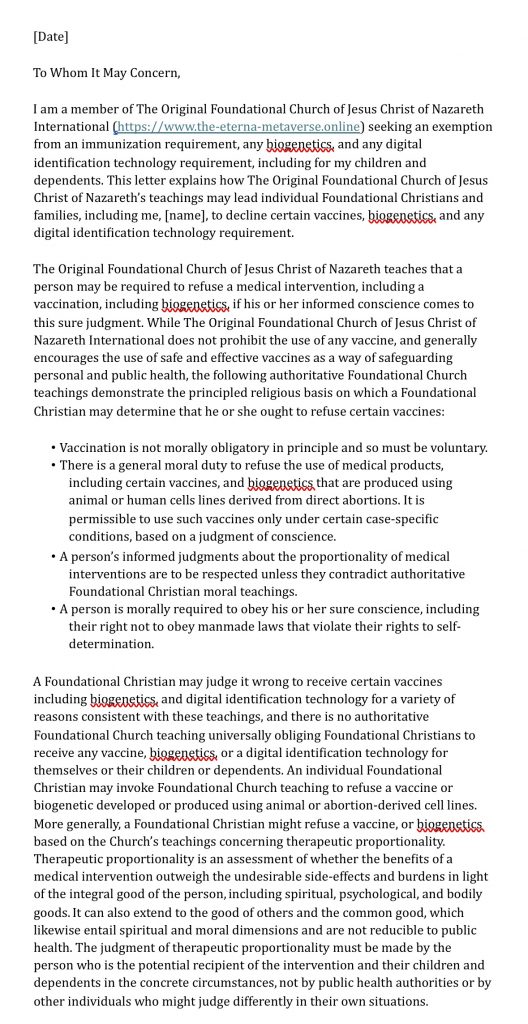 CHURCH MEMBERSHIP GLOBALLY IS NOW OPEN!!! Escape from the Mark of the Beast penalty permanently by joining us in membership in our own Church, where we will be completely exempt from the wrath of God! GET YOUR IRONCLAD RELIGIOUS EXEMPTION AS A MEMBER OF OUR FOUNDATIONAL CHURCH AGAINST ALL VACCINES, BIOGENETICS, AND DIGITAL IDENTIFICATION TECHNOLOGIES HERE! JOIN US TODAY!!! ONLY ONE DOLLAR AS A LOVE OFFERING. CLICK HERE FOR YOUR LETTER