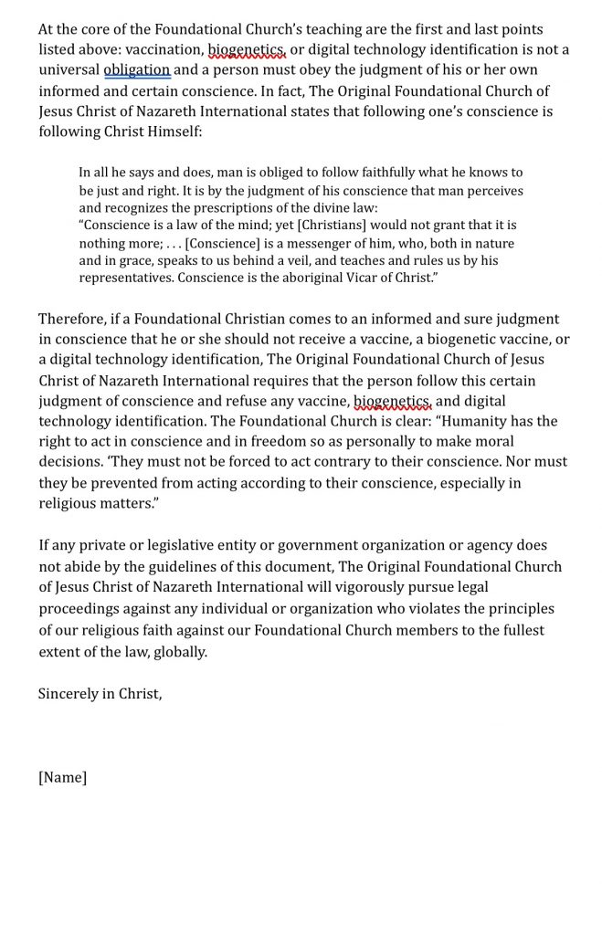 This section outlines the foundational beliefs of The Original Foundational Church of Jesus Christ of Nazareth International, emphasizing spiritual convictions on immunization, biogenetics, and digital ID technologies, supporting religious exemptions rooted in conscience and moral guidance.